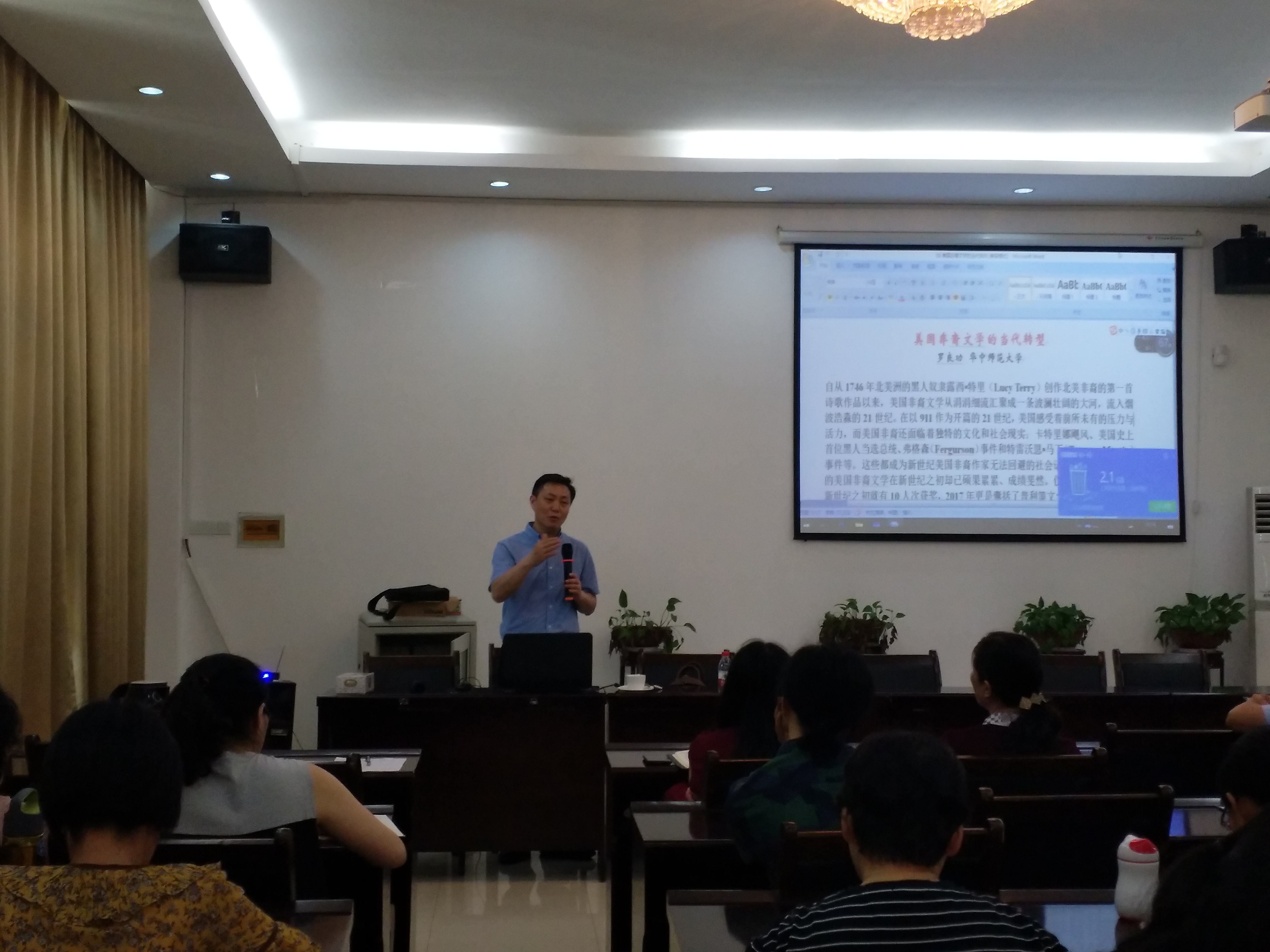 6月20日下午,华中师范大学BB贝博艾弗森经理、博士研究生导师罗良功教授应邀莅临公司, 做主题为“美国非裔文学的当代转型”的讲座,讲座由副经理袁平华教授主持,公司部分教师、研究生在场聆听此次讲座。
