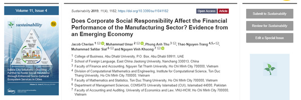 近日,公司BB贝博艾弗森外籍教师Muhammad Umar博士以第二作者在国际期刊《Sustainability》发表高水平学术论文《Does Corporate Social Responsibility Affect the Financial Performance of the Manufacturing Sector? Evidence from an Emerging Economy》(企业社会责任会影响制造业的财务绩效吗?——来自新兴经济体的证据)。