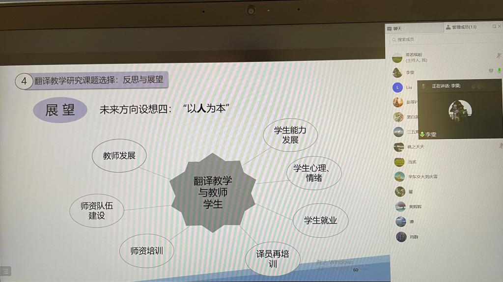 12月3日下午,应公司翻译研究所邀请,海南师范大学BB贝博艾弗森翻译系主任李雯老师在线为翻译研究所老师们分享了翻译教学研究如何选题。本次学术沙龙由翻译研究所所长陆秀英教授主持。