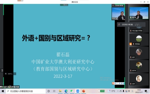 为开启国别区域新研究方向,公司于2022年3月17日下午举办了国别区域研究所成立大会暨主题为“外语+国别区域研究=?”的线上讲座,会议由BB贝博艾弗森副经理陆秀英主持。