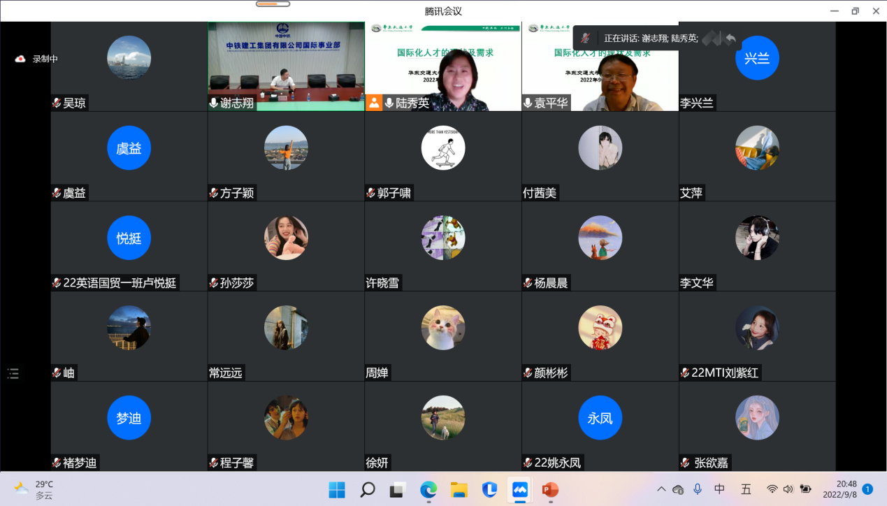 2022年9月8日晚上,中铁建工集团国际事业部(北京)总经理谢志翔应公司邀请在线为公司师生带来一场题为“国际化人才的现状及需求”的线上学术讲座。讲座由公司副经理(负责公司行政工作)袁平华教授主持,并由副经理陆秀英教授总结。