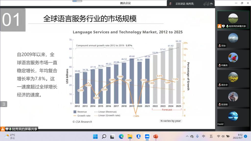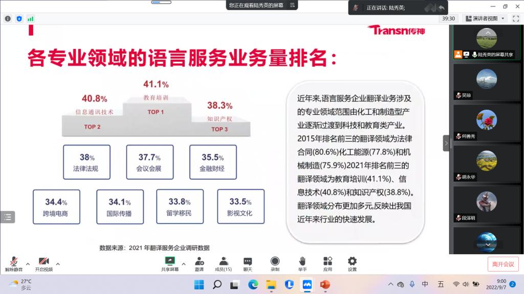 2022年9月7日上午,传神语联网网络科技股份有限公司副总裁闫栗丽应邀为公司师生在15栋102会议室带来一场题目为“新文科背景下的语言服务与国际传播”的学术讲座。本次讲座线下线上同步进行,由BB贝博艾弗森副经理陆秀英教授主持。