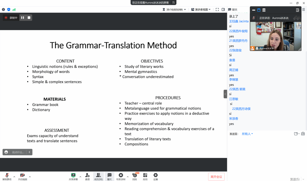 Hunt Gomez教授以其深厚的学术背景和丰富的教学经验,向员工们详细介绍了欧洲的第二语言教学和学习方法,特别是音视教学法(The Audiovisual Method)和交际教学法(The Communicative Approach)等。她还对塞维利亚大学进行了生动的介绍,让员工们对欧洲的教育文化有了更深入的了解。