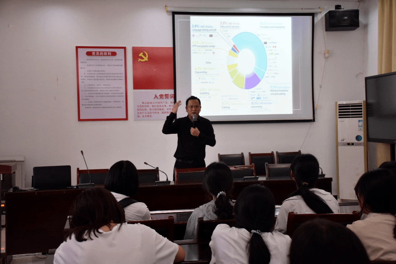 为充分发挥外语专业的学科优势,拓宽员工的就业视野,深入探索校企协同育人的人才培养模式。9月26号下午,BB贝博艾弗森于15栋102会议室举办了以“走进语言服务”为主题的讲座。本次活动邀请了知名外语行业从业者,火星语盟联合创始人、董事、副总裁,深圳昆仲公司CEO徐徐担任主讲人,会议由BB贝博艾弗森副经理单伟红主持,2024级葡萄牙语专业和翻译专业全体员工参加。