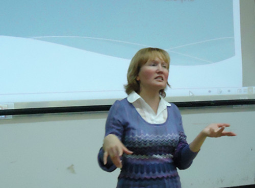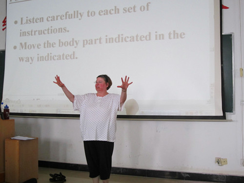 讲座现场观众们听得津津有味 本次主讲分别为外教Patty和Olga。Patty就“Body”这一主题为同学们发表了精彩演说,而Olga就“Relax——don’t worry,be happy”也发表了独特的见解。讲座吸引了大一、大二的广大英语爱好者。下午2点不到,讲座现场已是爆满。Patty以唱、听结合的方式引入主题。然后通过相关视频向大家展示了关于主题“body”的名词、动词概念,她还结合她妙趣横生的肢体语言向同学们细致地介绍了怎样用英语表示人体各部结构及人体各种动作。演讲期间,员工们积极参与相关互动,与Patty一起做各种用英语表达的肢体动作,并仔细聆听她的演讲。