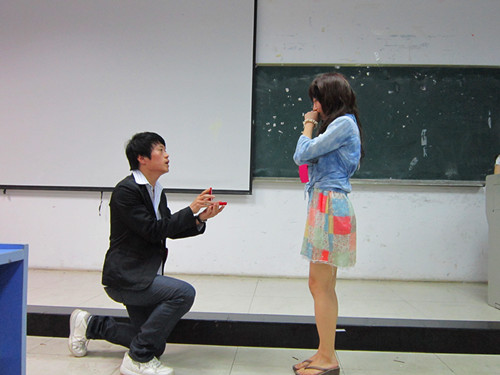 10国贸2班的精彩表演 在一曲甜美可爱的歌曲《Little Love》后,比赛继续如火如荼地展开。随后的作品《Loving your shoes》贯穿了中国食品安全、泰坦尼克号等热点话题,创意十足,颇具现实意义。而紧接下来的第五组演员则借用了大话西游的场景,人物扮相幽默可爱,情节夸张风趣。最后一组的表演同样吸引人的眼球。万能的老板以人的灵魂、健康、快乐为条件与人进行交换,贪婪的人们最终后悔不已。物质的富足不能给人真正的幸福,追求精神的富足才是人生的真谛。在一场精彩的魔术表演中比赛拉近尾声。