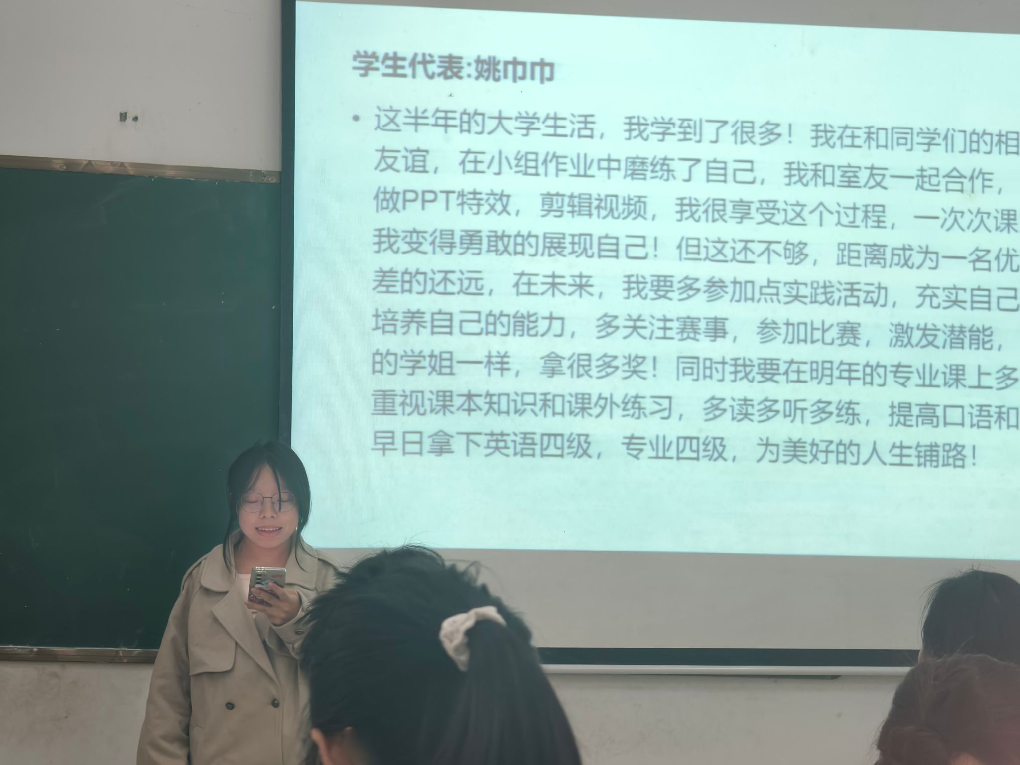 随后,姚巾巾同学作为班级员工代表,汇报了自己自入学以来的学习、生活。