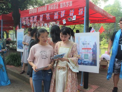 本届“红五月”英语文化艺术节以“中西文化交流”为主题,英文戏剧、英文小说、英文电影、英国王室和中国新疆、西藏、云南等省文化代表……从英语国家文化到大美中国风采,每个班级的展区都充满着文化气息,等待着同学们去感受。在一个“英式风情”的摊点上,精致的“英式”下午茶吸引了大批路人的驻足品尝,17英语(国贸)班通过独具特色的方式展示其主题“英国皇室”的魅力;17英语(国金)二班则用英文”快问快答“的方式,凸显公司特色的同时,传递着新疆的风土人情,活动现场人来人往,热闹非凡,欢声笑语不断。