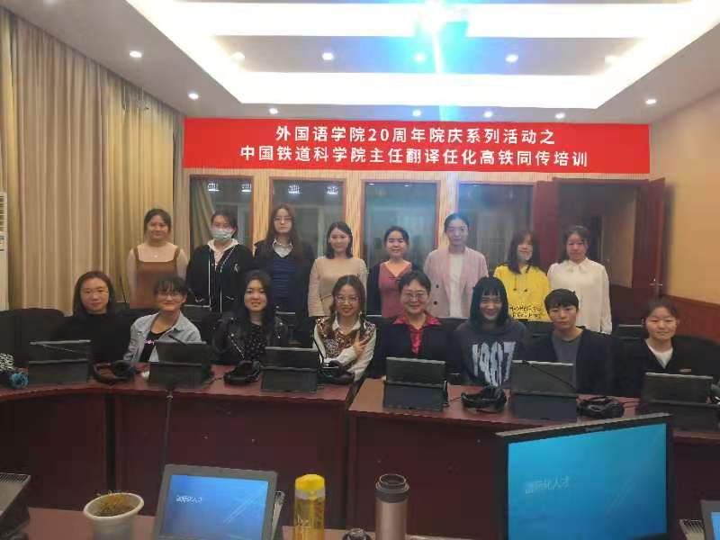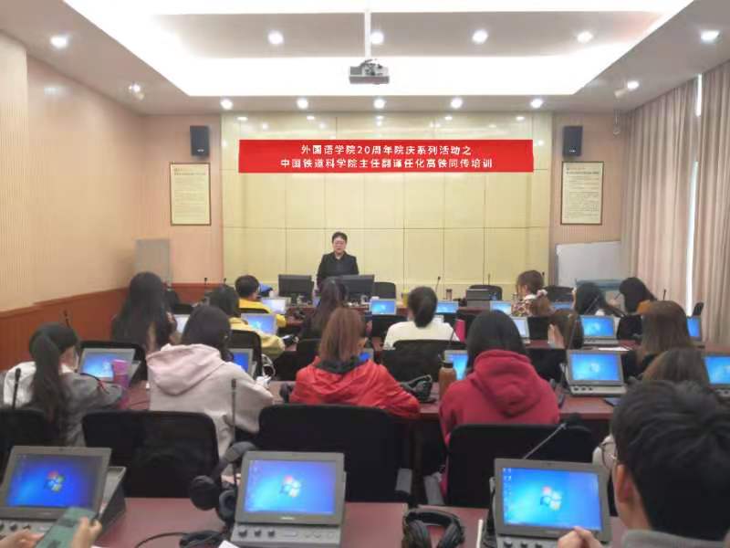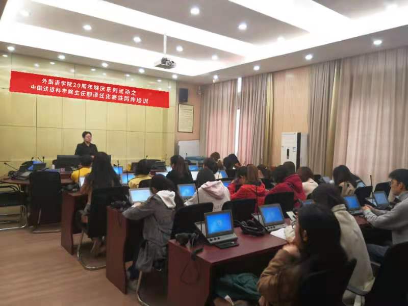 中国铁道科学研究院主任翻译任化教授应邀参加BB贝博艾弗森20周年院庆活动,并于11月19日至-20日在公司同传教室开展为期两天的高铁同传培训。外语公司彭翠老师陪同,翻译专业研究生和本科生踊跃参加。