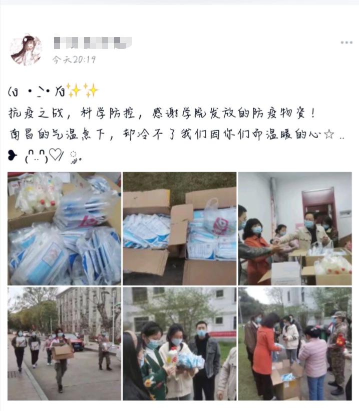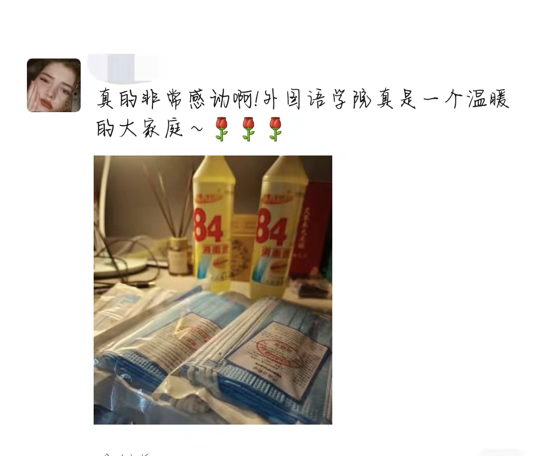 收到防疫物资,同学们都非常高兴,每位同学都认真收好物资,不少同学表示疫情来得太过突然,没能准备充足的口罩和消毒物品,这次公司的防疫物资发放宛如及时雨。同学们纷纷在网络空间表达了对公司的感恩感激之情,并称外院是一个温暖的大家庭。