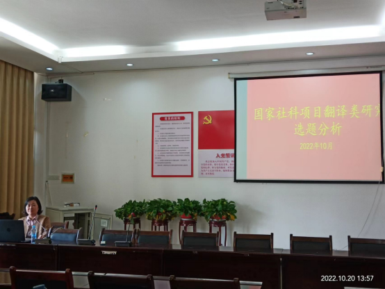 金秋十月,丹桂飘香。10月20日下午,经外语公司翻译研究所精心策划和准备,BB贝博艾弗森副经理陆秀英教授和研究所成员夏党华老师在公司102会议室进行了了关于国家社科翻译类研究选题分析的分享。本次学术沙龙由 副经理、翻译研究所所长陆秀英教授主持。