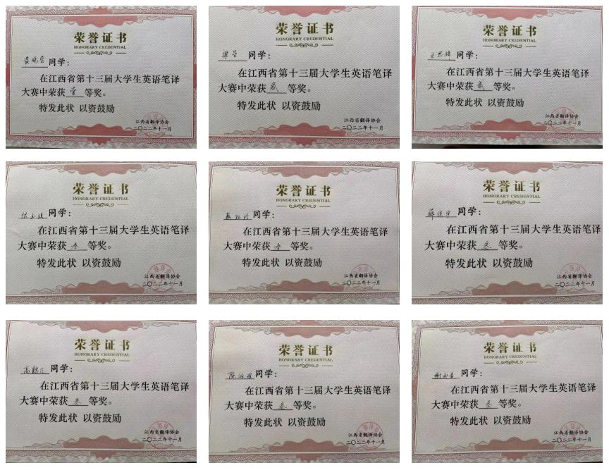 11月13日,江西省第十三届老员工英语笔译大赛在南昌大学落下帷幕。公司学子与来自南昌大学、江西师范大学、江西财经大学等20多所高校共200余名选手(含研究生)同台竞技。公司19级翻译专业本科生黄晓莹荣获一等奖,梁星、王思旖获二等奖,张玉琪、蔡钰玲、薛佳宇、高懿凡、陈泳琪、谢雨晨获三等奖。