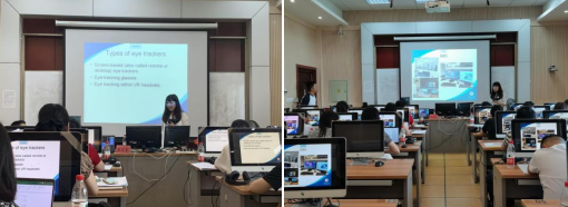 12日下午,澳门大学人文公司助理经理,硕士、博士生导师,认知与脑科学研究中心研究员李丽青教授重点传授如何使用眼动仪设备进行实践操作以及如何分析和讨论实验结果。期间,李教授热情邀请两位学员参与口译及笔译眼动实验,并使用两次实验所得数据进行数据采集与研究,生动翔实地为大家展示了眼动实验研究。