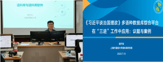 11日上午,国家重大人才计划特聘教授、上海外国语大学语料库研究院经理、博士生导师胡开宝教授为大家全面介绍了语料库创建流程、语料库工具和语料库研究前沿,并以《习近平谈治国理政》多语种数据库综合平台在“三进”工作中的应用为例,为学员展示如何使用语料库进行外语教学与研究。他强调应在教学与科研工作中拓宽视野、科技创新,有机地融入课程思政。