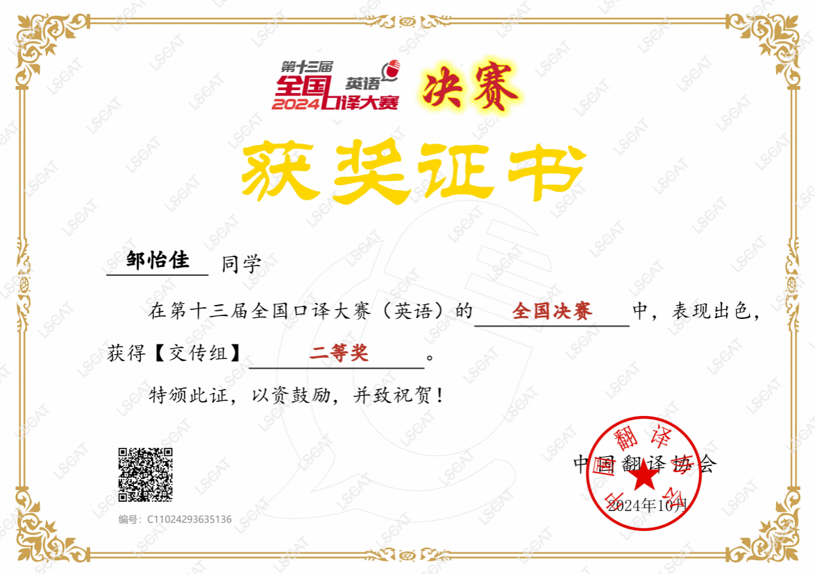 自2024年3月起,由中国翻译协会、中国翻译研究院主办的第十三届全国口译大赛(英语)开展得如火如荼,吸引公司学子踊跃参与,取得了优异的成绩。