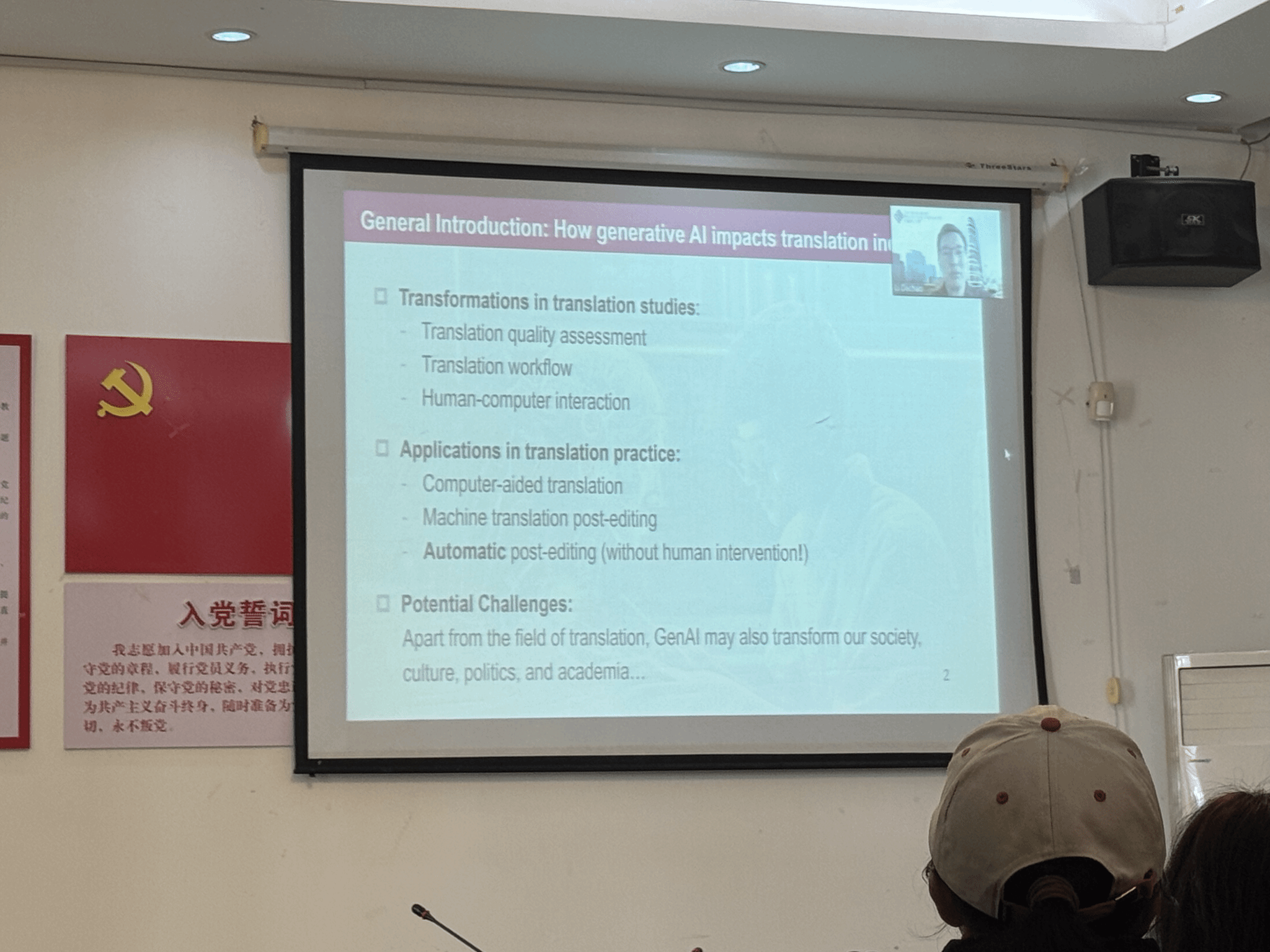 2024年12月25日下午14:00,香港理工大学中文及双语学系李德超教授应邀为公司师生做主题为《生成式人工智能在翻译领域的进展与应用》线上讲座。本次讲座由李星副经理主持,公司全体教师、2023级翻译硕士员工及翻译专业本科生在15-102会议室参加讲座。