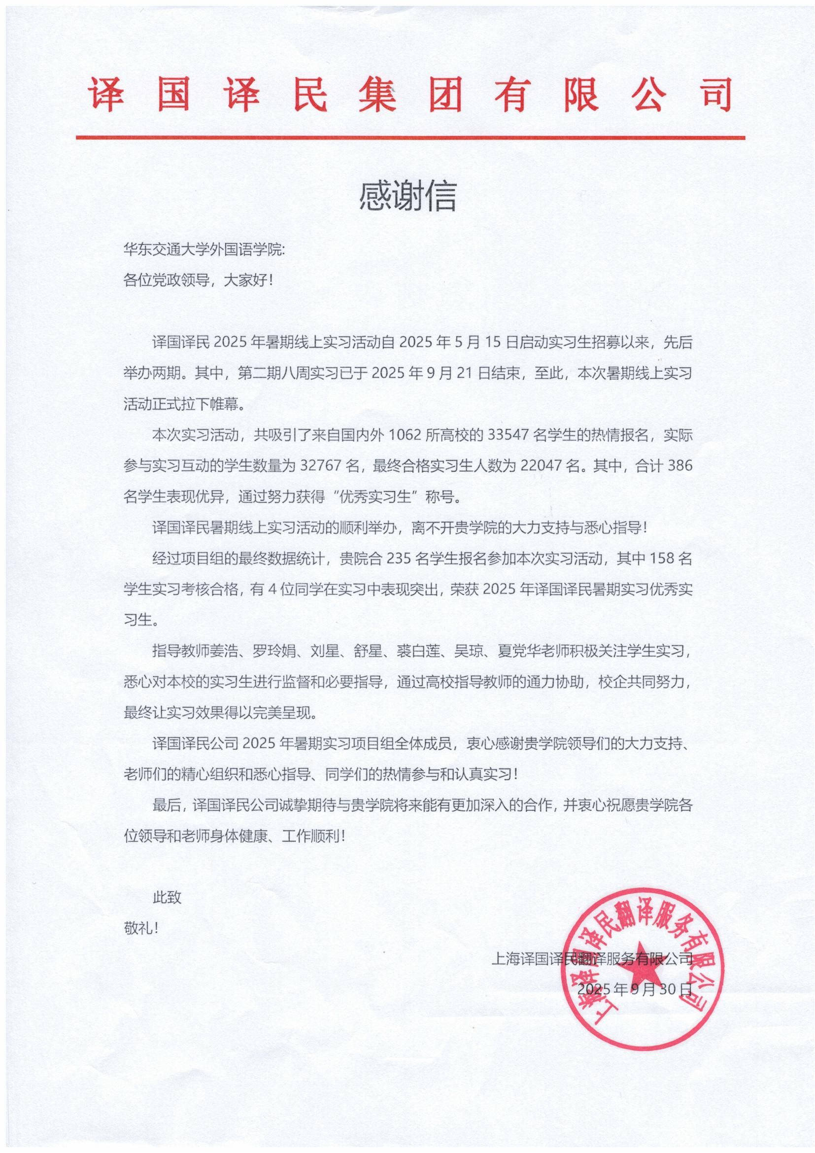 “习于智长,化于心成。”公司衷心期望,学子们所学所获,皆能转化为未来步入社会后的宝贵财富。展望未来,公司将继续深化与企业实习合作,以此为契机,进一步整合优质教学资源,创新实践教学模式,打造更高质量的专业实习平台。我们坚信,校企双方的共同努力必将培养更多杰出外语人才,为社会发展注入蓬勃活力,为翻译事业的繁荣贡献力量。